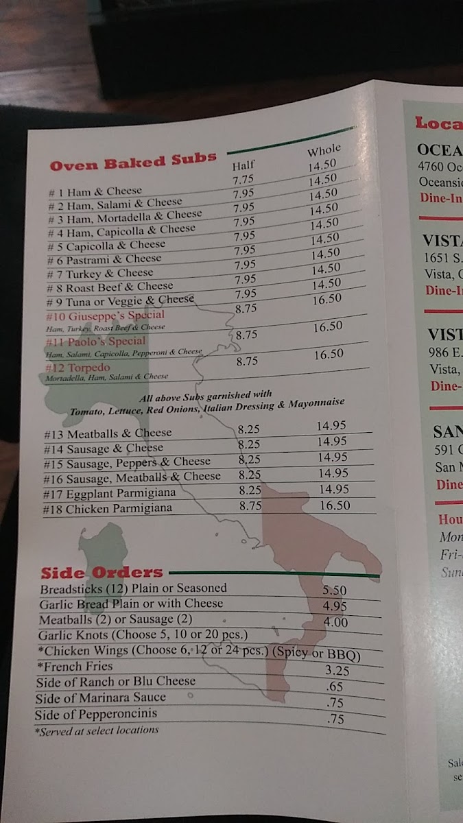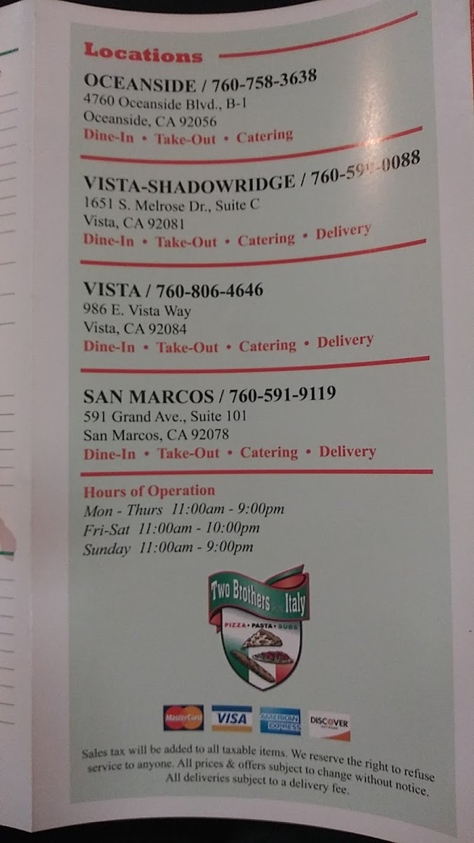 Welcome to Two Brothers from Italy, your go-to destination for authentic Italian flavors right in Vista, CA. Nestled at 986 E Vista Way, this cozy eatery presents a menu that expertly combines tradition and taste. Prepare for a culinary adventure with delightful options like their calzones, generously stuffed with ingredients such as meat, ricotta, and mozzarella, each bursting with flavor.